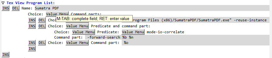 M-x customize-variable). The first isTeX-view-program-list, which is perhaps the most complicated. TheNameshould read asSumatra PDF, and theChoiceshould be set toCommand parts. Then, you will need to insert (INS) twoCommand parts: